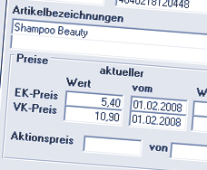 der Ware mit Artikelnummer, Barcode, Produktnamen, Salonnamen und Preis.
